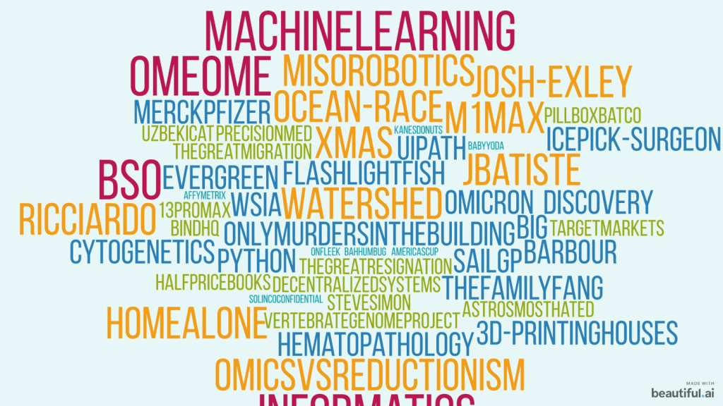 Dave has an absurd variety of interests and experiences. Fortunately/unfortunately he now has a pesky primary focus as a pathology resident at Beth Israel Deaconess Medical Center/Harvard Medical School. Soon, he’ll be moving on to an informatics fellowship during which he’ll learn more innovative tools to explore ideas involving tech/biotechnology, precision medicine, genomics and machine learning. Below is an infinitely evolving word cloud that gives you insight into his thoughts.